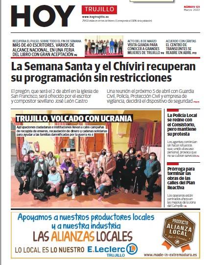 En esta nueva publicación, se destacan las diferentes manifestaciones solidarias que ha habido a lo largo del mes con las victimas de la guerra de Ucrania, así como los actos más importantes que se llevarán a cabo durante la Semana Santa trujillana, que vuelve sin restricciones sanitarias. También se incluye la información relativa a las reivindicaciones de la Policía Local. No falta tampoco la información sobre las obras que se están llevando a cabo en la zona del Campillo.